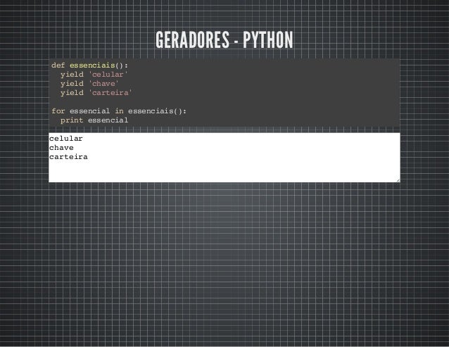 36. 36. GERADORES - PYTHON defessenciais(): yield'celular' yield'chave' yield'carteira' foressencialinessenciais(): printessencial celular chave carteira
