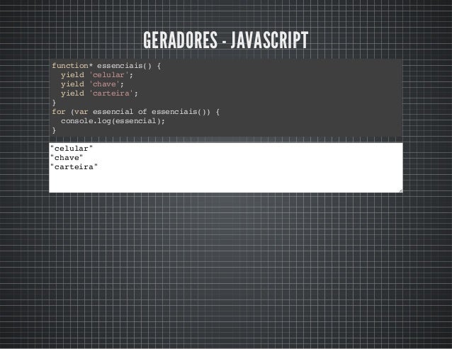 37. 37. GERADORES - JAVASCRIPT function*essenciais(){ yield'celular'; yield'chave'; yield'carteira'; } for(varessencialofessenciais()){ console.log(essencial); } "celular" "chave" "carteira"