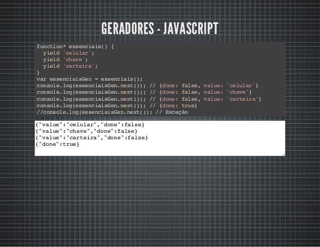 38. 38. GERADORES - JAVASCRIPT function*essenciais(){ yield'celular'; yield'chave'; yield'carteira'; } varessenciaisGen=essenciais(); console.log(essenciaisGen.next());//{done:false,value:'celular'} console.log(essenciaisGen.next());//{done:false,value:'chave'} console.log(essenciaisGen.next());//{done:false,value:'carteira'} console.log(essenciaisGen.next());//{done:true} //console.log(essenciaisGen.next());//Exceção {"value":"celular","done":false} {"value":"chave","done":false} {"value":"carteira","done":false} {"done":true}