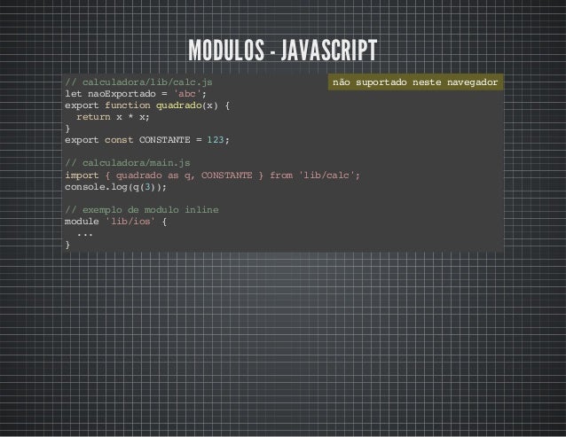 44. 44. MODULOS - JAVASCRIPT //calculadora/lib/calc.js letnaoExportado='abc'; exportfunctionquadrado(x){ returnx*x; } exportconstCONSTANTE=123; //calculadora/main.js import{quadradoasq,CONSTANTE}from'lib/calc'; console.log(q(3)); //exemplodemoduloinline module'lib/ios'{ ... } nãosuportadonestenavegador