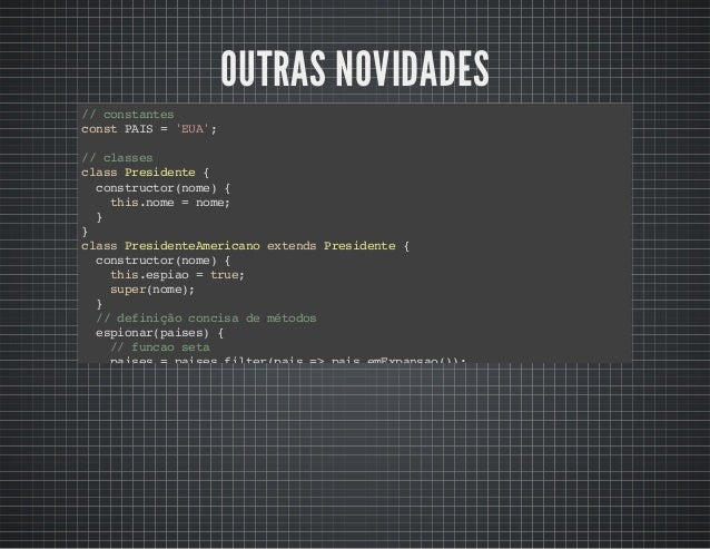 45. 45. OUTRAS NOVIDADES //constantes constPAIS='EUA'; //classes classPresidente{ constructor(nome){ this.nome=nome; } } classPresidenteAmericanoextendsPresidente{ constructor(nome){ this.espiao=true; super(nome); } //definiçãoconcisademétodos espionar(paises){ //funcaoseta paises=paises.filter(pais=>pais.emExpansao()); //escopoembloco //'pais'é'undefined'foradoblocodo"for" for(letpaisofpaises){ //... } returntrue; } } //Map,Set,WeakMap,Symbol,quasi-literals,Proxy,emuitomais!