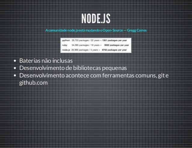 6. 6. NODE.JS Acomunidadenode.jsestámudandooOpen-Source—GreggCaines Baterias não inclusas Desenvolvimento de bibliotecas pequenas Desenvolvimento acontece com ferramentas comuns, gite github.com