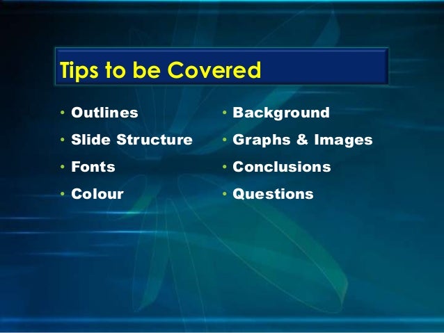 2. 2. • Outlines • Slide Structure • Fonts • Colour • Background • Graphs & Images • Conclusions • Questions Tips to be Covered