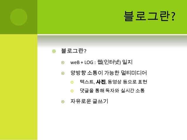 2. 2. 블로그란?  블로그란?  weB + LOG : 웹(인터넷) 일지  양방향 소통이 가능한 멀티미디어  텍스트, 사진, 동영상 등으로 표현  댓글을 통해 독자와 실시간 소통  자유로운 글쓰기
