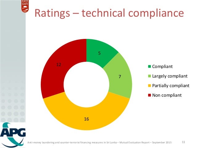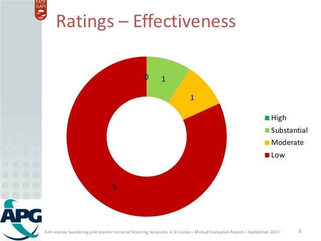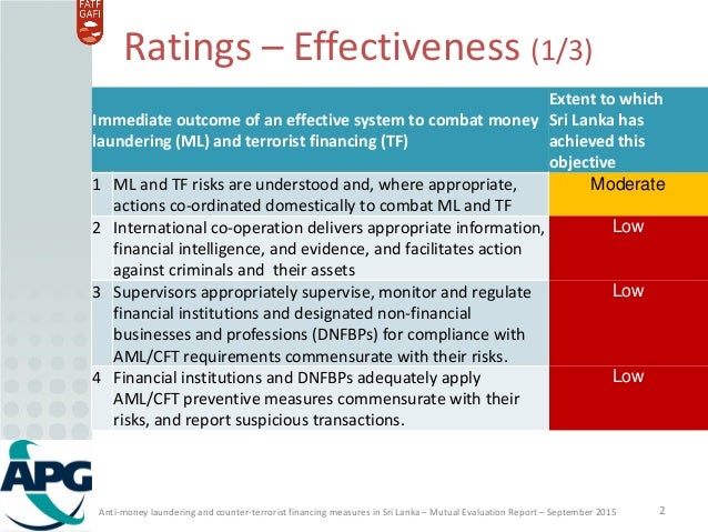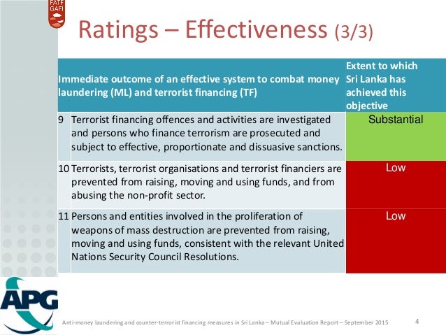 APG assessment of the anti-money laundering and counter-terrorist financing (AML/CFT) measures in Sri Lanka. Ratings of the levels of technical compliance and effectiveness.