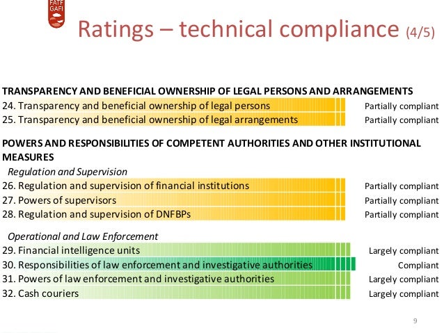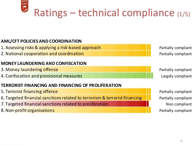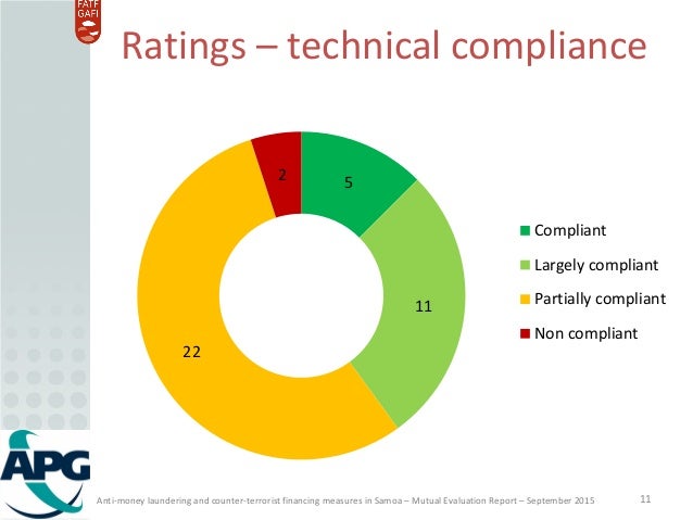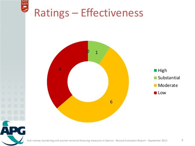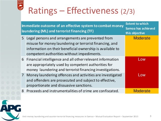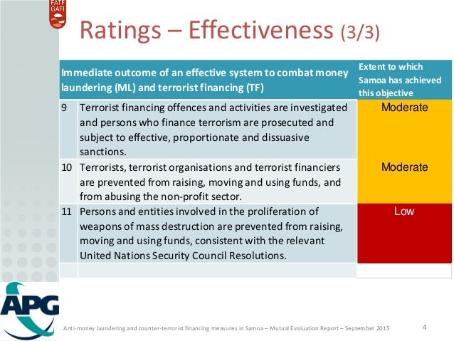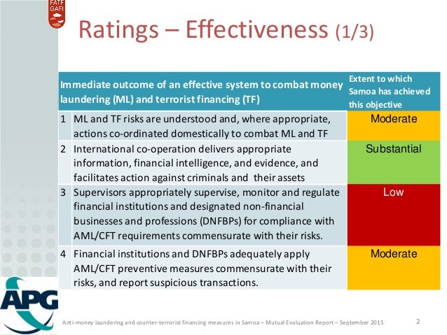 APG assessment of the anti-money laundering and counter-terrorist financing (AML/CFT) measures in Samoa. Ratings of the levels of technical compliance and effectiveness.