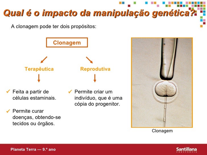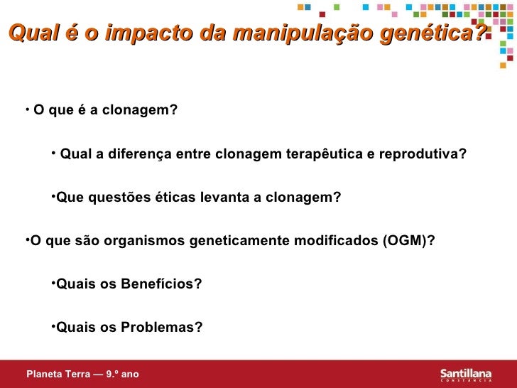 6. 6. Qual é o impacto da manipulação genética? Planeta Terra — 9.º ano <ul><li>O que é a clonagem? </li></ul><ul><ul><li>Qual a diferença entre clonagem terapêutica e reprodutiva? </li></ul></ul><ul><ul><li>Que questões éticas levanta a clonagem? </li></ul></ul><ul><li>O que são organismos geneticamente modificados (OGM)? </li></ul><ul><ul><li>Quais os Benefícios? </li></ul></ul><ul><ul><li>Quais os Problemas? </li></ul></ul>