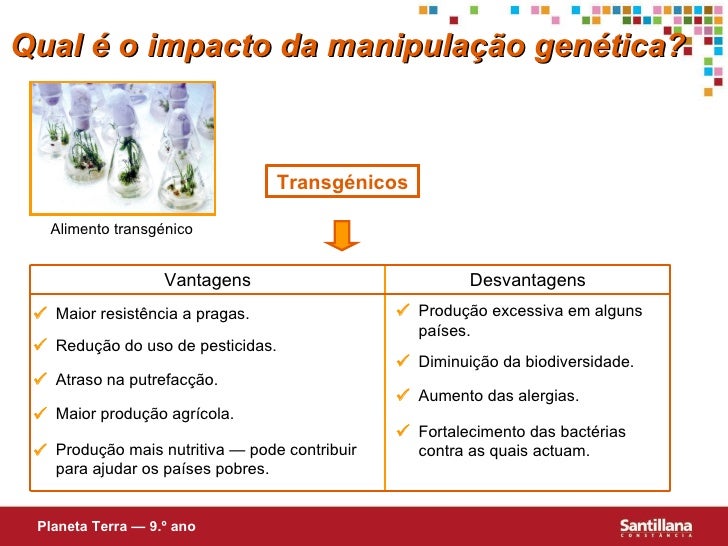 5. 5. Transgénicos Qual é o impacto da manipulação genética? Planeta Terra — 9.º ano Vantagens Desvantagens  Maior resistência a pragas.  Redução do uso de pesticidas.  Atraso na putrefacção.  Maior produção agrícola. Produção mais nutritiva — pode contribuir para ajudar os países pobres.   Produção excessiva em alguns países.  Diminuição da biodiversidade.  Aumento das alergias.  Fortalecimento das bactérias contra as quais actuam. Alimento transgénico