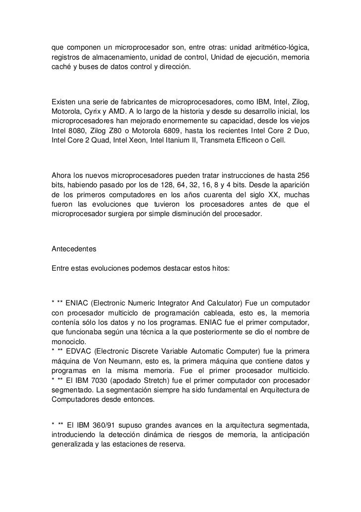 2. 2. que componen un microprocesador son, entre otras: unidad aritmético-lógica,registros de almacenamiento, unidad de control, Unidad de ejecución, memoriacaché y buses de datos control y dirección.Existen una serie de fabricantes de microprocesadores, como IBM, Intel, Zilog,Motorola, Cyrix y AMD. A lo largo de la historia y desde su desarrollo inicial, losmicroprocesadores han mejorado enormemente su capacidad, desde los viejosIntel 8080, Zilog Z80 o Motorola 6809, hasta los recientes Intel Core 2 Duo,Intel Core 2 Quad, Intel Xeon, Intel Itanium II, Transmeta Efficeon o Cell.Ahora los nuevos microprocesadores pueden tratar instrucciones de hasta 256bits, habiendo pasado por los de 128, 64, 32, 16, 8 y 4 bits. Desde la apariciónde los primeros computadores en los años cuarenta del siglo XX, muchasfueron las evoluciones que tuvieron los procesadores antes de que elmicroprocesador surgiera por simple disminución del procesador.AntecedentesEntre estas evoluciones podemos destacar estos hitos:* ** ENIAC (Electronic Numeric Integrator And Calculator) Fue un computadorcon procesador multiciclo de programación cableada, esto es, la memoriacontenía sólo los datos y no los programas. ENIAC fue el primer computador,que funcionaba según una técnica a la que posteriormente se dio el nombre demonociclo.* ** EDVAC (Electronic Discrete Variable Automatic Computer) fue la primeramáquina de Von Neumann, esto es, la primera máquina que contiene datos yprogramas en la misma memoria. Fue el primer procesador multiciclo.* ** El IBM 7030 (apodado Stretch) fue el primer computador con procesadorsegmentado. La segmentación siempre ha sido fundamental en Arquitectura deComputadores desde entonces.* ** El IBM 360/91 supuso grandes avances en la arquitectura segmentada,introduciendo la detección dinámica de riesgos de memoria, la anticipacióngeneralizada y las estaciones de reserva.