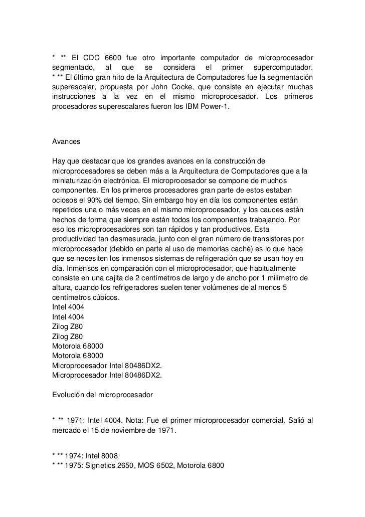 3. 3. * ** El CDC 6600 fue otro importante computador de microprocesadorsegmentado, al que se considera el primer supercomputador.* ** El último gran hito de la Arquitectura de Computadores fue la segmentaciónsuperescalar, propuesta por John Cocke, que consiste en ejecutar muchasinstrucciones a la vez en el mismo microprocesador. Los primerosprocesadores superescalares fueron los IBM Power-1.AvancesHay que destacar que los grandes avances en la construcción demicroprocesadores se deben más a la Arquitectura de Computadores que a laminiaturización electrónica. El microprocesador se compone de muchoscomponentes. En los primeros procesadores gran parte de estos estabanociosos el 90% del tiempo. Sin embargo hoy en día los componentes estánrepetidos una o más veces en el mismo microprocesador, y los cauces estánhechos de forma que siempre están todos los componentes trabajando. Poreso los microprocesadores son tan rápidos y tan productivos. Estaproductividad tan desmesurada, junto con el gran número de transistores pormicroprocesador (debido en parte al uso de memorias caché) es lo que haceque se necesiten los inmensos sistemas de refrigeración que se usan hoy endía. Inmensos en comparación con el microprocesador, que habitualmenteconsiste en una cajita de 2 centímetros de largo y de ancho por 1 milímetro dealtura, cuando los refrigeradores suelen tener volúmenes de al menos 5centímetros cúbicos.Intel 4004Intel 4004Zilog Z80Zilog Z80Motorola 68000Motorola 68000Microprocesador Intel 80486DX2.Microprocesador Intel 80486DX2.Evolución del microprocesador* ** 1971: Intel 4004. Nota: Fue el primer microprocesador comercial. Salió almercado el 15 de noviembre de 1971.* ** 1974: Intel 8008* ** 1975: Signetics 2650, MOS 6502, Motorola 6800
