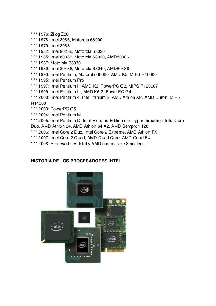 4. 4. * ** 1976: Zilog Z80* ** 1978: Intel 8086, Motorola 68000* ** 1979: Intel 8088* ** 1982: Intel 80286, Motorola 68020* ** 1985: Intel 80386, Motorola 68020, AMD80386* ** 1987: Motorola 68030* ** 1989: Intel 80486, Motorola 68040, AMD80486* ** 1993: Intel Pentium, Motorola 68060, AMD K5, MIPS R10000* ** 1995: Intel Pentium Pro* ** 1997: Intel Pentium II, AMD K6, PowerPC G3, MIPS R120007* ** 1999: Intel Pentium III, AMD K6-2, PowerPC G4* ** 2000: Intel Pentium 4, Intel Itanium 2, AMD Athlon XP, AMD Duron, MIPSR14000* ** 2003: PowerPC G5* ** 2004: Intel Pentium M* ** 2005: Intel Pentium D, Intel Extreme Edition con hyper threading, Intel CoreDuo, AMD Athlon 64, AMD Athlon 64 X2, AMD Sempron 128.* ** 2006: Intel Core 2 Duo, Intel Core 2 Extreme, AMD Athlon FX* ** 2007: Intel Core 2 Quad, AMD Quad Core, AMD Quad FX* ** 2008: Procesadores Intel y AMD con más de 8 núcleos.HISTORIA DE LOS PROCESADORES INTEL