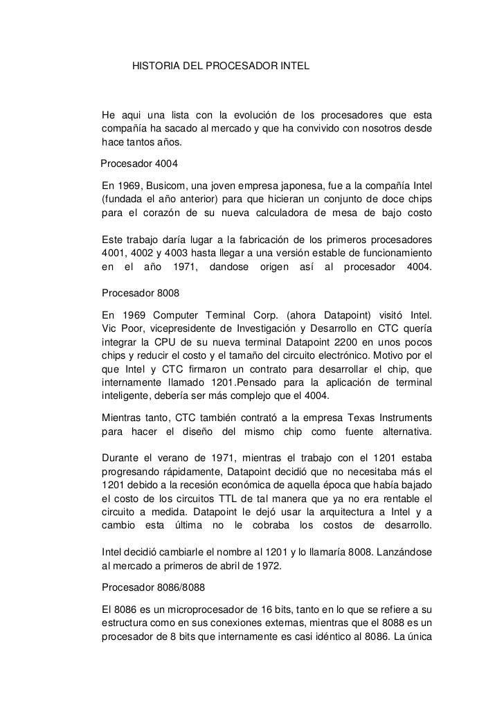 5. 5. HISTORIA DEL PROCESADOR INTELHe aqui una lista con la evolución de los procesadores que estacompañía ha sacado al mercado y que ha convivido con nosotros desdehace tantos años.Procesador 4004En 1969, Busicom, una joven empresa japonesa, fue a la compañía Intel(fundada el año anterior) para que hicieran un conjunto de doce chipspara el corazón de su nueva calculadora de mesa de bajo costoEste trabajo daría lugar a la fabricación de los primeros procesadores4001, 4002 y 4003 hasta llegar a una versión estable de funcionamientoen el año 1971, dandose origen así al procesador 4004.Procesador 8008En 1969 Computer Terminal Corp. (ahora Datapoint) visitó Intel.Vic Poor, vicepresidente de Investigación y Desarrollo en CTC queríaintegrar la CPU de su nueva terminal Datapoint 2200 en unos pocoschips y reducir el costo y el tamaño del circuito electrónico. Motivo por elque Intel y CTC firmaron un contrato para desarrollar el chip, queinternamente llamado 1201.Pensado para la aplicación de terminalinteligente, debería ser más complejo que el 4004.Mientras tanto, CTC también contrató a la empresa Texas Instrumentspara hacer el diseño del mismo chip como fuente alternativa.Durante el verano de 1971, mientras el trabajo con el 1201 estabaprogresando rápidamente, Datapoint decidió que no necesitaba más el1201 debido a la recesión económica de aquella época que había bajadoel costo de los circuitos TTL de tal manera que ya no era rentable elcircuito a medida. Datapoint le dejó usar la arquitectura a Intel y acambio esta última no le cobraba los costos de desarrollo.Intel decidió cambiarle el nombre al 1201 y lo llamaría 8008. Lanzándoseal mercado a primeros de abril de 1972.Procesador 8086/8088El 8086 es un microprocesador de 16 bits, tanto en lo que se refiere a suestructura como en sus conexiones externas, mientras que el 8088 es unprocesador de 8 bits que internamente es casi idéntico al 8086. La única