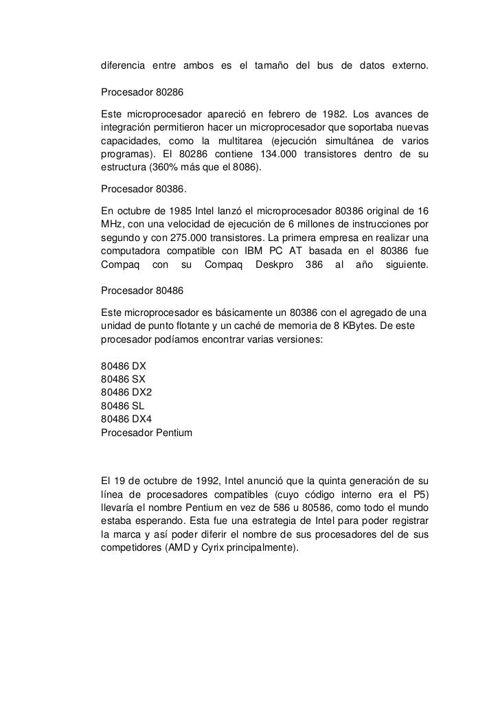 6. 6. diferencia entre ambos es el tamaño del bus de datos externo.Procesador 80286Este microprocesador apareció en febrero de 1982. Los avances deintegración permitieron hacer un microprocesador que soportaba nuevascapacidades, como la multitarea (ejecución simultánea de variosprogramas). El 80286 contiene 134.000 transistores dentro de suestructura (360% más que el 8086).Procesador 80386.En octubre de 1985 Intel lanzó el microprocesador 80386 original de 16MHz, con una velocidad de ejecución de 6 millones de instrucciones porsegundo y con 275.000 transistores. La primera empresa en realizar unacomputadora compatible con IBM PC AT basada en el 80386 fueCompaq con su Compaq Deskpro 386 al año siguiente.Procesador 80486Este microprocesador es básicamente un 80386 con el agregado de unaunidad de punto flotante y un caché de memoria de 8 KBytes. De esteprocesador podíamos encontrar varias versiones:80486 DX80486 SX80486 DX280486 SL80486 DX4Procesador PentiumEl 19 de octubre de 1992, Intel anunció que la quinta generación de sulínea de procesadores compatibles (cuyo código interno era el P5)llevaría el nombre Pentium en vez de 586 u 80586, como todo el mundoestaba esperando. Esta fue una estrategia de Intel para poder registrarla marca y así poder diferir el nombre de sus procesadores del de suscompetidores (AMD y Cyrix principalmente).