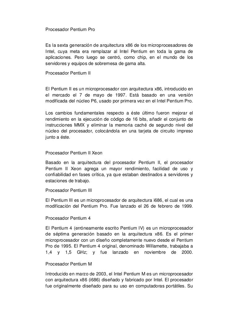 7. 7. Procesador Pentium ProEs la sexta generación de arquitectura x86 de los microprocesadores deIntel, cuya meta era remplazar al Intel Pentium en toda la gama deaplicaciones. Pero luego se centró, como chip, en el mundo de losservidores y equipos de sobremesa de gama alta.Procesador Pentium IIEl Pentium II es un microprocesador con arquitectura x86, introducido enel mercado el 7 de mayo de 1997. Está basado en una versiónmodificada del núcleo P6, usado por primera vez en el Intel Pentium Pro.Los cambios fundamentales respecto a éste último fueron mejorar elrendimiento en la ejecución de código de 16 bits, añadir el conjunto deinstrucciones MMX y eliminar la memoria caché de segundo nivel delnúcleo del procesador, colocándola en una tarjeta de circuito impresojunto a éste.Procesador Pentium II XeonBasado en la arquitectura del procesador Pentium II, el procesadorPentium II Xeon agrega un mayor rendimiento, facilidad de uso yconfiabilidad en fases crítica, ya que estaban destinados a servidores yestaciones de trabajo.Procesador Pentium IIIEl Pentium III es un microprocesador de arquitectura i686, el cual es unamodificación del Pentium Pro. Fue lanzado el 26 de febrero de 1999.Procesador Pentium 4El Pentium 4 (erróneamente escrito Pentium IV) es un microprocesadorde séptima generación basado en la arquitectura x86. Es el primermicroprocesador con un diseño completamente nuevo desde el PentiumPro de 1995. El Pentium 4 original, denominado Willamette, trabajaba a1,4 y 1,5 GHz; y fue lanzado en noviembre de 2000.Procesador Pentium MIntroducido en marzo de 2003, el Intel Pentium M es un microprocesadorcon arquitectura x86 (i686) diseñado y fabricado por Intel. El procesadorfue originalmente diseñado para su uso en computadoras portátiles. Su