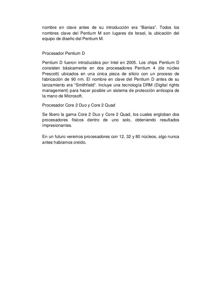 8. 8. nombre en clave antes de su introducción era “Banias”. Todos losnombres clave del Pentium M son lugares de Israel, la ubicación delequipo de diseño del Pentium M.Procesador Pentium DPentium D fueron introducidos por Intel en 2005. Los chips Pentium Dconsisten básicamente en dos procesadores Pentium 4 (de núcleoPrescott) ubicados en una única pieza de silicio con un proceso defabricación de 90 nm. El nombre en clave del Pentium D antes de sulanzamiento era “Smithfield”. Incluye una tecnología DRM (Digital rightsmanagement) para hacer posible un sistema de protección anticopia dela mano de Microsoft.Procesador Core 2 Duo y Core 2 QuadSe libero la gama Core 2 Duo y Core 2 Quad, los cuales engloban dosprocesadores físicos dentro de uno solo, obteniendo resultadosimpresionantes.En un futuro veremos procesadores con 12, 32 y 80 núcleos, algo nuncaantes habíamos creído.