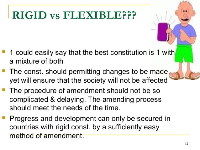 12. 12. RIGID vs FLEXIBLE???  1 could easily say that the best constitution is 1 with a mixture of both  The const. should permitting changes to be made, yet will ensure that the society will not be affected  The procedure of amendment should not be so complicated & delaying. The amending process should meet the needs of the time.  Progress and development can only be secured in countries with rigid const. by a sufficiently easy method of amendment. 12