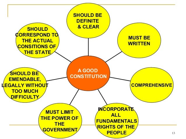 13. 13. SHOULD CORRESPOND TO THE ACTUAL CONSITIONS OF THE STATE SHOULD BE EMENDABLE, LEGALLY WITHOUT TOO MUCH DIFFICULTY MUST LIMIT THE POWER OF THE GOVERNMENT INCORPORATE ALL FUNDAMENTALS RIGHTS OF THE PEOPLE COMPREHENSIVE MUST BE WRITTEN SHOULD BE DEFINITE & CLEAR A GOOD CONSTITUTION 13