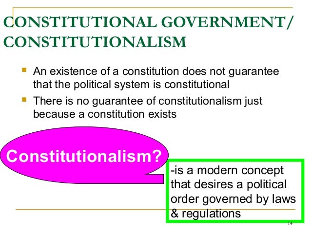 14. 14. -is a modern concept that desires a political order governed by laws & regulations CONSTITUTIONAL GOVERNMENT/ CONSTITUTIONALISM  An existence of a constitution does not guarantee that the political system is constitutional  There is no guarantee of constitutionalism just because a constitution exists Constitutionalism? 14