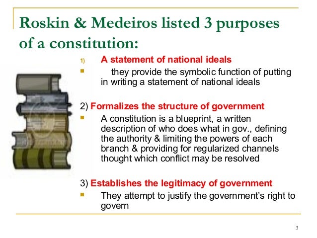 3. 3. Roskin & Medeiros listed 3 purposes of a constitution: 1) A statement of national ideals  they provide the symbolic function of putting in writing a statement of national ideals 2) Formalizes the structure of government  A constitution is a blueprint, a written description of who does what in gov., defining the authority & limiting the powers of each branch & providing for regularized channels thought which conflict may be resolved 3) Establishes the legitimacy of government  They attempt to justify the government’s right to govern 3