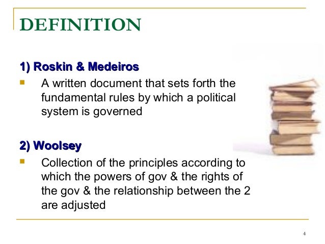 4. 4. DEFINITION 1) Roskin & Medeiros1) Roskin & Medeiros  A written document that sets forth the fundamental rules by which a political system is governed 2) Woolsey2) Woolsey  Collection of the principles according to which the powers of gov & the rights of the gov & the relationship between the 2 are adjusted 4