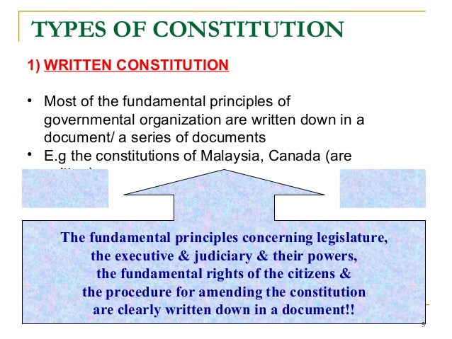 5. 5. TYPES OF CONSTITUTION 1) WRITTEN CONSTITUTION • Most of the fundamental principles of governmental organization are written down in a document/ a series of documents • E.g the constitutions of Malaysia, Canada (are written) The fundamental principles concerning legislature, the executive & judiciary & their powers, the fundamental rights of the citizens & the procedure for amending the constitution are clearly written down in a document!! 5
