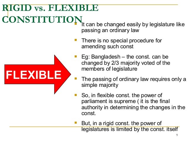 8. 8. 3.) RIGID vs. FLEXIBLE CONSTITUTION  Can’t be changed easily ( there is distinct method/ procedure for amending the const. which is very complicated & rigorous & not limited to the authority of legislature alone  Eg: USA const. can’t be amended by Congress alone (it needs the approval of the people in a Referendum  Eg: Canada const. can’t be changed just by the Parliament (it needs the approval of the 7 provincial legislatures of 10 provinces having 50% of the total populations RIGID 8
