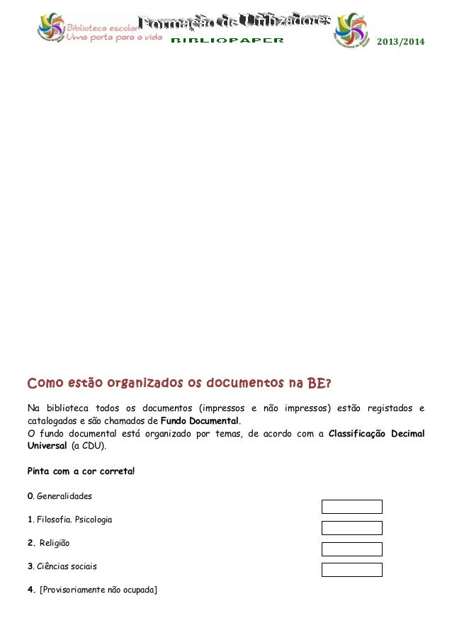 2. 2. 2013/2014 Como estão organizados os documentos na BE? Na biblioteca todos os documentos (impressos e não impressos) estão registados e catalogados e são chamados de Fundo Documental. O fundo documental está organizado por temas, de acordo com a Classificação Decimal Universal (a CDU). Pinta com a cor correta! 0. Generalidades 1. Filosofia. Psicologia 2. Religião 3. Ciências sociais 4. [Provisoriamente não ocupada]