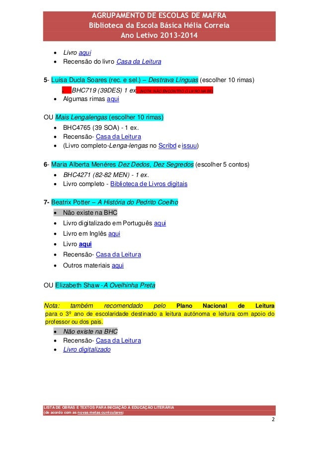 2. 2. AGRUPAMENTO DE ESCOLAS DE MAFRA Biblioteca da Escola Básica Hélia Correia Ano Letivo 2013-2014   Livro aqui Recensão do livro Casa da Leitura 5- Luísa Ducla Soares (rec. e sel.) – Destrava Línguas (escolher 10 rimas) BHC719 (39DES) 1 ex. (NOTA: NÃO ENCONTRO O LIVRO NA BE) Algumas rimas aqui   OU Mais Lengalengas (escolher 10 rimas)    BHC4765 (39 SOA) - 1 ex. Recensão- Casa da Leitura (Livro completo-Lenga-lengas no Scribd e issuu) 6- Maria Alberta Menéres Dez Dedos, Dez Segredos (escolher 5 contos)   BHC4271 (82-82 MEN) - 1 ex. Livro completo - Biblioteca de Livros digitais 7- Beatrix Potter – A História do Pedrito Coelho  Não existe na BHC  Livro digitalizado em Português aqui  Livro em Inglês aqui  Livro aqui  Recensão- Casa da Leitura  Outros materiais aqui OU Elizabeth Shaw -A Ovelhinha Preta Nota: também recomendado pelo Plano Nacional de Leitura para o 3º ano de escolaridade destinado a leitura autónoma e leitura com apoio do professor ou dos pais.    Não existe na BHC Recensão- Casa da Leitura Livro digitalizado LISTA DE OBRAS E TEXTOS PARA INICIAÇÃO À EDUCAÇÃO LITERÁRIA (de acordo com as novas metas curriculares) 2