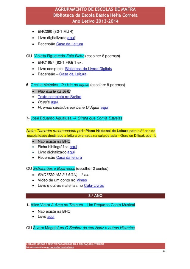 4. 4. AGRUPAMENTO DE ESCOLAS DE MAFRA Biblioteca da Escola Básica Hélia Correia Ano Letivo 2013-2014  BHC290 (82-1 MUR)  Livro digitalizado aqui  Recensão Casa da Leitura OU Violeta Figueiredo Fala Bicho (escolher 8 poemas)  BHC1957 (82-1 FIG) 1 ex.   Livro completo- Biblioteca de Livros Digitais Recensão – Casa da Leitura 6- Cecília Meireles- Ou isto ou aquilo (escolher 8 poemas)     Não existe na BHC Texto completo no Scribd Poesia aqui Poemas cantados por Lena D’ Água aqui 7- José Eduardo Agualusa -A Girafa que Comia Estrelas Nota: Também recomendado pelo Plano Nacional de Leitura para o 2º ano de escolaridade destinado a leitura orientada na sala de aula - Grau de Dificuldade III.     Não existe na BHC Ficha bibliográfica aqui Livro digitalizado aqui Recensão Casa da leitura OU Estranhões e Bizarrocos (escolher 2 contos)    BHC1739 (82-3 I AGU) - 1 ex. Vídeo de um conto no Vimeo Livro e outros materiais no Cata-Livros 3.º ANO 1- Alice Vieira A Arca do Tesouro – Um Pequeno Conto Musical   Não existe na BHC Livro aqui OU Álvaro Magalhães O Senhor do seu Nariz e outras Histórias LISTA DE OBRAS E TEXTOS PARA INICIAÇÃO À EDUCAÇÃO LITERÁRIA (de acordo com as novas metas curriculares) 4