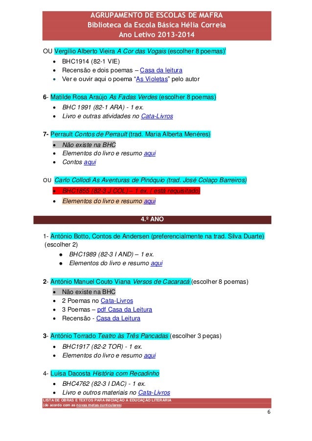 6. 6. AGRUPAMENTO DE ESCOLAS DE MAFRA Biblioteca da Escola Básica Hélia Correia Ano Letivo 2013-2014 OU Vergílio Alberto Vieira A Cor das Vogais (escolher 8 poemas)i    BHC1914 (82-1 VIE) Recensão e dois poemas – Casa da leitura Ver e ouvir aqui o poema “As Violetas” pelo autor 6- Matilde Rosa Araújo As Fadas Verdes (escolher 8 poemas)   BHC 1991 (82-1 ARA) - 1 ex. Livro e outras atividades no Cata-Livros 7- Perrault Contos de Perrault (trad. Maria Alberta Menéres)    Não existe na BHC Elementos do livro e resumo aqui Contos aqui OU Carlo Collodi As Aventuras de Pinóquio (trad. José Colaço Barreiros)  BHC1855 (82-3 J COL) – 1 ex. ( está requisitado)  Elementos do livro e resumo aqui 4.º ANO 1- António Botto, Contos de Andersen (preferencialmente na trad. Silva Duarte) (escolher 2)   BHC1989 (82-3 I AND) – 1 ex. Elementos do livro e resumo aqui 2- António Manuel Couto Viana Versos de Cacaracá (escolher 8 poemas)     Não existe na BHC 2 Poemas no Cata-Livros 3 Poemas – pdf Casa da Leitura Recensão - Casa da Leitura 3- António Torrado Teatro às Três Pancadas (escolher 3 peças)   BHC1917 (82-2 TOR) - 1 ex. Elementos do livro e resumo aqui 4- Luísa Dacosta História com Recadinho   BHC4762 (82-3 I DAC) - 1 ex. Livro e outros materiais no Cata-Livros LISTA DE OBRAS E TEXTOS PARA INICIAÇÃO À EDUCAÇÃO LITERÁRIA (de acordo com as novas metas curriculares) 6