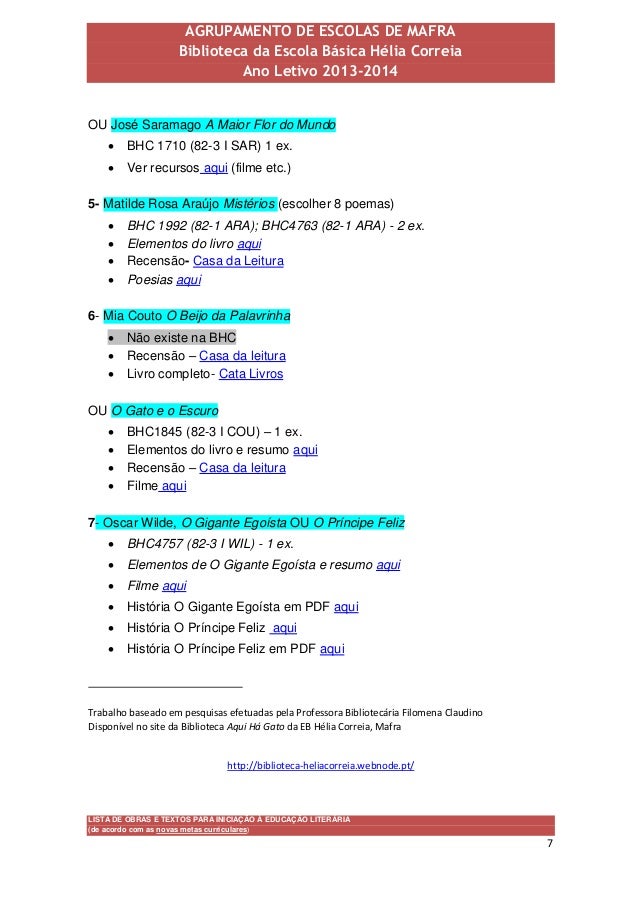 7. 7. AGRUPAMENTO DE ESCOLAS DE MAFRA Biblioteca da Escola Básica Hélia Correia Ano Letivo 2013-2014 OU José Saramago A Maior Flor do Mundo  BHC 1710 (82-3 I SAR) 1 ex.  Ver recursos aqui (filme etc.) 5- Matilde Rosa Araújo Mistérios (escolher 8 poemas)     BHC 1992 (82-1 ARA); BHC4763 (82-1 ARA) - 2 ex. Elementos do livro aqui Recensão- Casa da Leitura Poesias aqui 6- Mia Couto O Beijo da Palavrinha    Não existe na BHC Recensão – Casa da leitura Livro completo- Cata Livros OU O Gato e o Escuro     BHC1845 (82-3 I COU) – 1 ex. Elementos do livro e resumo aqui Recensão – Casa da leitura Filme aqui 7- Oscar Wilde, O Gigante Egoísta OU O Príncipe Feliz  BHC4757 (82-3 I WIL) - 1 ex.  Elementos de O Gigante Egoísta e resumo aqui  Filme aqui  História O Gigante Egoísta em PDF aqui  História O Príncipe Feliz aqui  História O Príncipe Feliz em PDF aqui Trabalho baseado em pesquisas efetuadas pela Professora Bibliotecária Filomena Claudino Disponível no site da Biblioteca Aqui Há Gato da EB Hélia Correia, Mafra http://biblioteca-heliacorreia.webnode.pt/ LISTA DE OBRAS E TEXTOS PARA INICIAÇÃO À EDUCAÇÃO LITERÁRIA (de acordo com as novas metas curriculares) 7