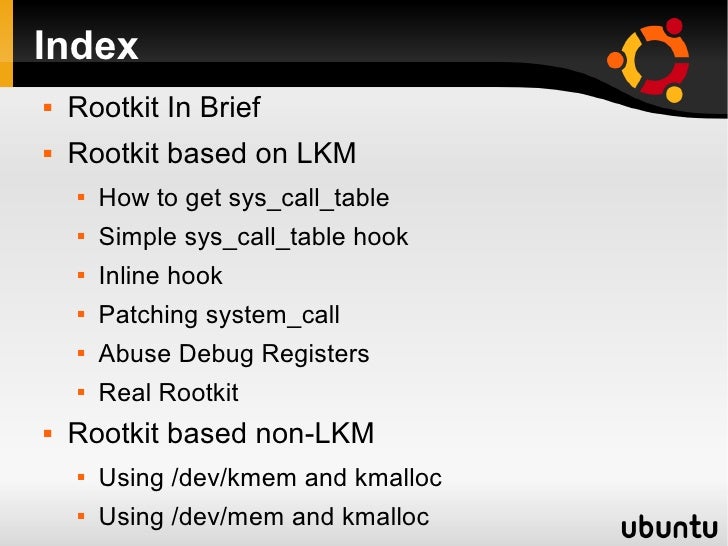 3. 3. Index Rootkit In Brief  Rootkit based on LKM  How to get sys_call_table  Simple sys_call_table hook  Inline hook  Patching system_call  Abuse Debug Registers  Real Rootkit  Rootkit based non-LKM  Using /dev/kmem and kmalloc  Using /dev/mem and kmalloc 