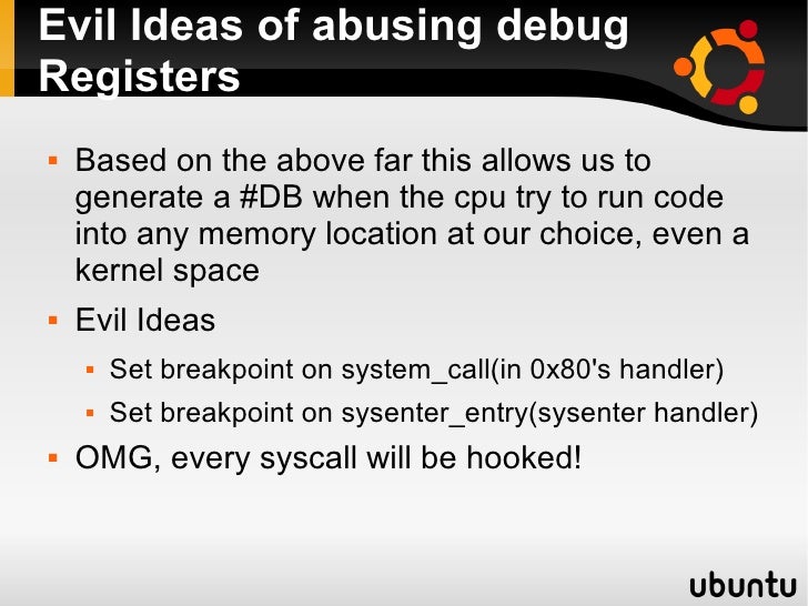 32. 32. Evil Ideas of abusing debug Registers Based on the above far this allows us to  generate a #DB when the cpu try to run code into any memory location at our choice, even a kernel space Evil Ideas  Set breakpoint on system_call(in 0x80's handler)  Set breakpoint on sysenter_entry(sysenter handler)  OMG, every syscall will be hooked! 