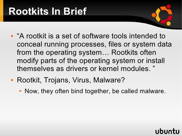 4. 4. Rootkits In Brief “A rootkit is a set of software tools intended to  conceal running processes, files or system data from the operating system… Rootkits often modify parts of the operating system or install themselves as drivers or kernel modules. ” Rootkit, Trojans, Virus, Malware?  Now, they often bind together, be called malware. 