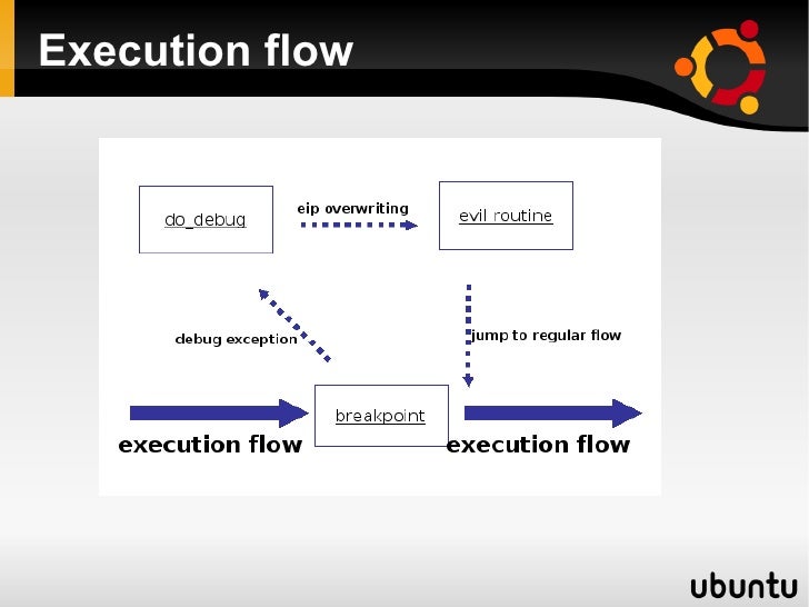 38. 38. Debug register hook From hacked_do_debug can then have access  to the value of eip representing the return address on the person who triggered the breakpoint, which is the kernel in our case, so you can change at will the flow of execution after the procedure! Changing eip can send a running our routine  that once made the 'dirty work' take care to restore the original flow of execution regs->eip = (unsigned int)hook_table[regs->eax];