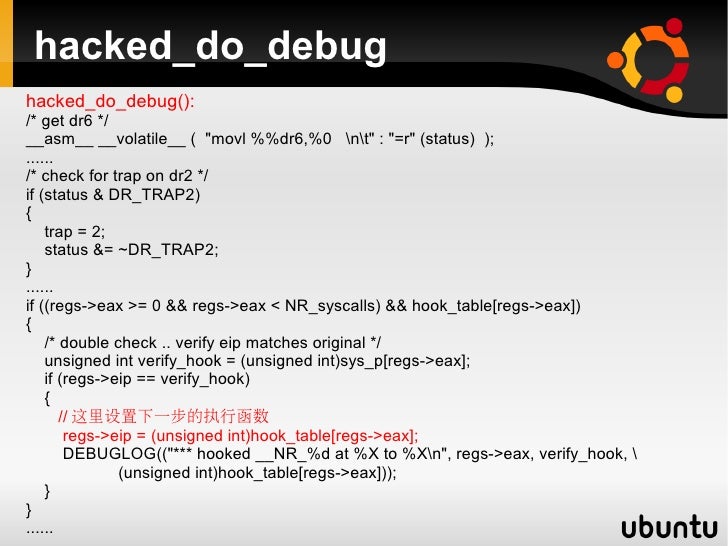 40. 40. hacked_do_debug hacked_do_debug(): /* get dr6 */ __asm__ __volatile__ ( quot;movl %%dr6,%0 ntquot; : quot;=rquot; (status) ); ...... /* check for trap on dr2 */ if (status & DR_TRAP2) { trap = 2; status &= ~DR_TRAP2; } ...... if ((regs->eax >= 0 && regs->eax < NR_syscalls) && hook_table[regs->eax]) { /* double check .. verify eip matches original */ unsigned int verify_hook = (unsigned int)sys_p[regs->eax]; if (regs->eip == verify_hook) { // 这里设置下一步的执行函数 regs->eip = (unsigned int)hook_table[regs->eax]; DEBUGLOG((quot;*** hooked __NR_%d at %X to %Xnquot;, regs->eax, verify_hook, (unsigned int)hook_table[regs->eax])); } } ......