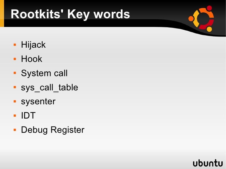 7. 7. Rootkits' Key words Hijack  Hook  System call  sys_call_table  sysenter  IDT  Debug Register 