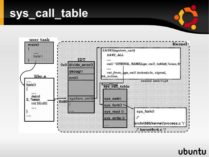 16. 16. get_system_call struct idt_descriptor void *get_system_call(void) { { unsigned short off_low; unsigned char idtr[6]; unsigned short sel; unsigned long base; unsigned char none, flags; struct idt_descriptor desc; unsigned short off_high; }; asm (quot;sidt %0quot; : quot;=mquot; (idtr)); base = *((unsigned long *) &idtr[2]); memcpy(&desc, (void *) (base + (0x80*8)), sizeof(desc)); return((void *) ((desc.off_high << 16) + desc.off_low)); } /*********** fin get_sys_call_table() ***********/