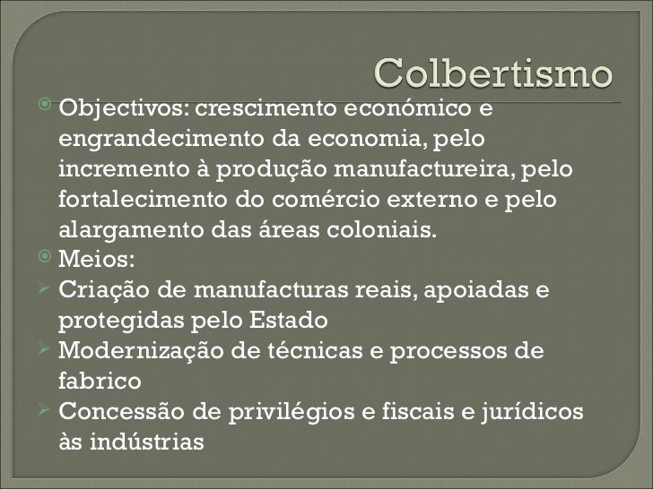 10. 10. <ul><li>Objectivos: crescimento económico e engrandecimento da economia, pelo incremento à produção manufactureira, pelo fortalecimento do comércio externo e pelo alargamento das áreas coloniais. </li></ul><ul><li>Meios: </li></ul><ul><li>Criação de manufacturas reais, apoiadas e protegidas pelo Estado </li></ul><ul><li>Modernização de técnicas e processos de fabrico </li></ul><ul><li>Concessão de privilégios e fiscais e jurídicos às indústrias </li></ul>