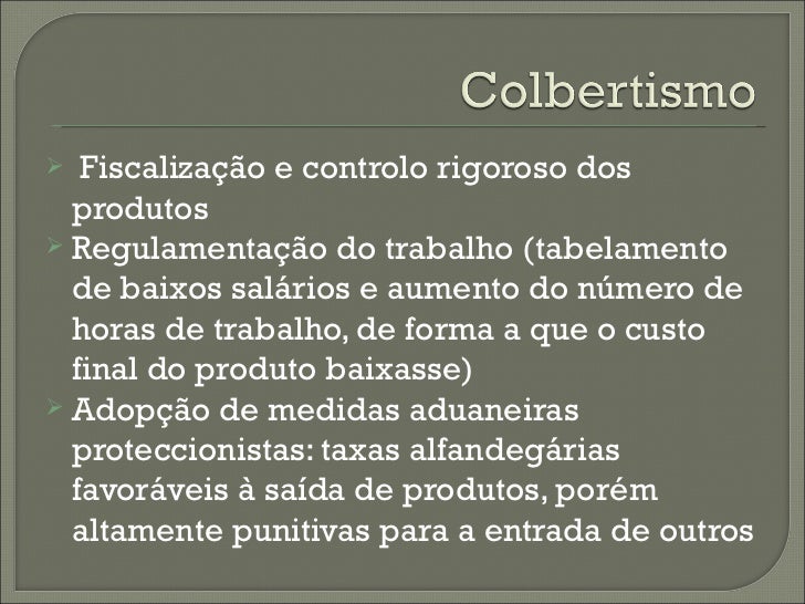 11. 11. <ul><li>Fiscalização e controlo rigoroso dos produtos </li></ul><ul><li>Regulamentação do trabalho (tabelamento de baixos salários e aumento do número de horas de trabalho, de forma a que o custo final do produto baixasse) </li></ul><ul><li>Adopção de medidas aduaneiras proteccionistas: taxas alfandegárias favoráveis à saída de produtos, porém altamente punitivas para a entrada de outros </li></ul>