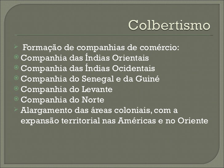 12. 12. <ul><li>Formação de companhias de comércio: </li></ul><ul><li>Companhia das Índias Orientais </li></ul><ul><li>Companhia das Índias Ocidentais </li></ul><ul><li>Companhia do Senegal e da Guiné </li></ul><ul><li>Companhia do Levante </li></ul><ul><li>Companhia do Norte </li></ul><ul><li>Alargamento das áreas coloniais, com a expansão territorial nas Américas e no Oriente </li></ul>