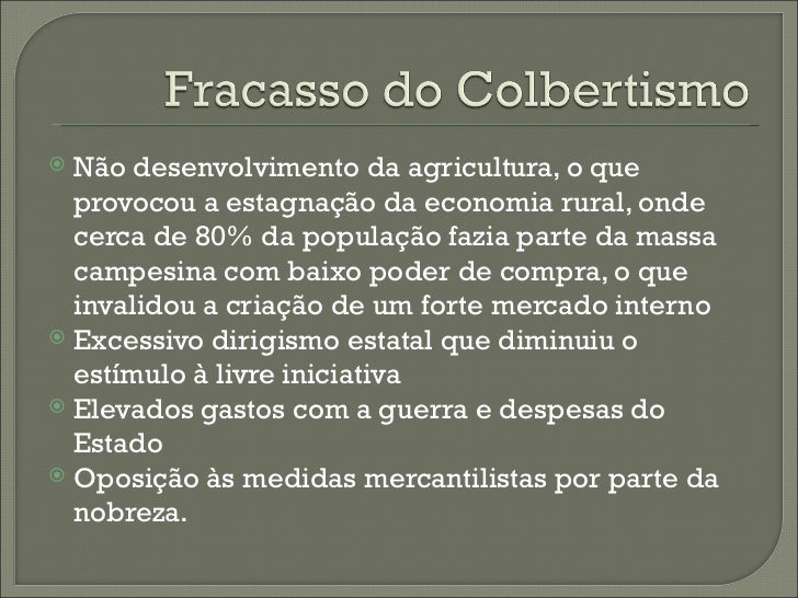 13. 13. <ul><li>Não desenvolvimento da agricultura, o que provocou a estagnação da economia rural, onde cerca de 80% da população fazia parte da massa campesina com baixo poder de compra, o que invalidou a criação de um forte mercado interno </li></ul><ul><li>Excessivo dirigismo estatal que diminuiu o estímulo à livre iniciativa </li></ul><ul><li>Elevados gastos com a guerra e despesas do Estado </li></ul><ul><li>Oposição às medidas mercantilistas por parte da nobreza. </li></ul>