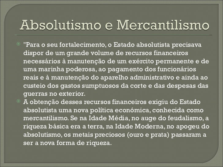 14. 15. <ul><li>&quot;Para o seu fortalecimento, o Estado absolutista precisava dispor de um grande volume de recursos financeiros necessários à manutenção de um exército permanente e de uma marinha poderosa, ao pagamento dos funcionários reais e à manutenção do aparelho administrativo e ainda ao custeio dos gastos sumptuosos da corte e das despesas das guerras no exterior. </li></ul><ul><li>A obtenção desses recursos financeiros exigiu do Estado absolutista uma nova política económica, conhecida como mercantilismo. Se na Idade Média, no auge do feudalismo, a riqueza básica era a terra, na Idade Moderna, no apogeu do absolutismo, os metais preciosos (ouro e prata) passaram a ser a nova forma de riqueza. </li></ul>