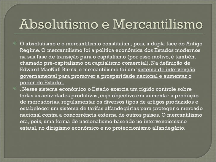 15. 16. <ul><li>O absolutismo e o mercantilismo constituíam, pois, a dupla face do Antigo Regime. O mercantilismo foi a política económica dos Estados modernos na sua fase de transição para o capitalismo (por esse motivo, é também chamado pré-capitalismo ou capitalismo comercial). Na definição de Edward MacNall Burns, o mercantilismo foi um ‘ sistema de intervenção governamental para promover a prosperidade nacional e aumentar o poder do Estado’. </li></ul><ul><li>. Nesse sistema económico o Estado exercia um rígido controle sobre todas as actividades produtivas, cujo objectivo era aumentar a produção de mercadorias, regulamentar os diversos tipos de artigos produzidos e estabelecer um sistema de tarifas alfandegárias para proteger o mercado nacional contra a concorrência externa de outros países. O mercantilismo era, pois, uma forma de nacionalismo baseado no intervencionismo estatal, no dirigismo económico e no proteccionismo alfandegário. </li></ul>