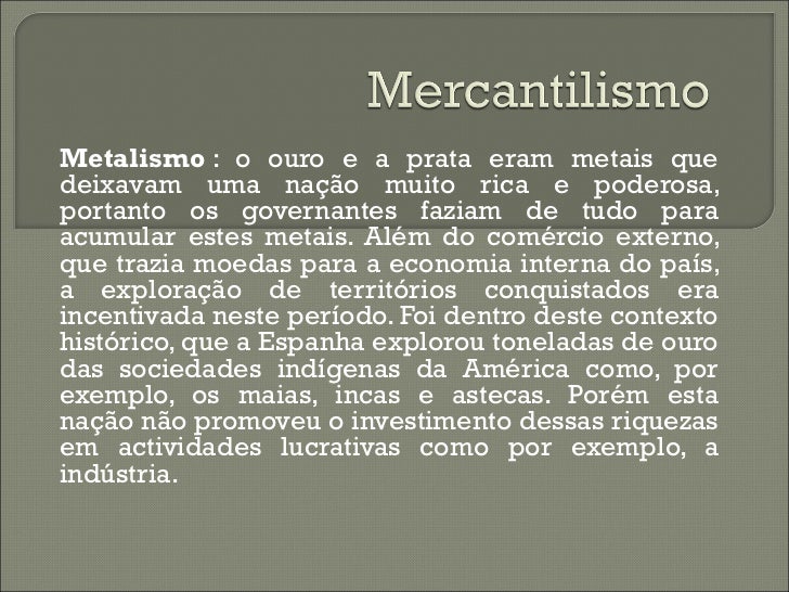 2. 2. Metalismo  : o ouro e a prata eram metais que deixavam uma nação muito rica e poderosa, portanto os governantes faziam de tudo para acumular estes metais. Além do comércio externo, que trazia moedas para a economia interna do país, a exploração de territórios conquistados era incentivada neste período. Foi dentro deste contexto histórico, que a Espanha explorou toneladas de ouro das sociedades indígenas da América como, por exemplo, os maias, incas e astecas. Porém esta nação não promoveu o investimento dessas riquezas em actividades lucrativas como por exemplo, a indústria.