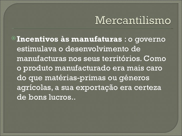 3. 3. <ul><li>Incentivos às manufaturas  : o governo estimulava o desenvolvimento de manufacturas nos seus territórios. Como o produto manufacturado era mais caro do que matérias-primas ou géneros agrícolas, a sua exportação era certeza de bons lucros.. </li></ul>