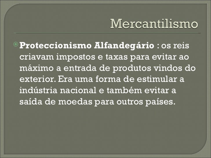 4. 4. <ul><li>Proteccionismo Alfandegário  : os reis criavam impostos e taxas para evitar ao máximo a entrada de produtos vindos do exterior. Era uma forma de estimular a indústria nacional e também evitar a saída de moedas para outros países. </li></ul>