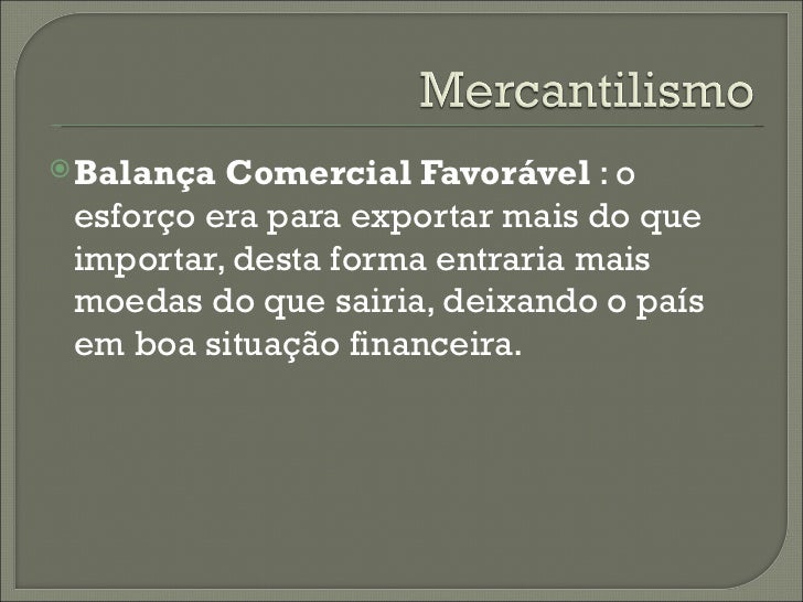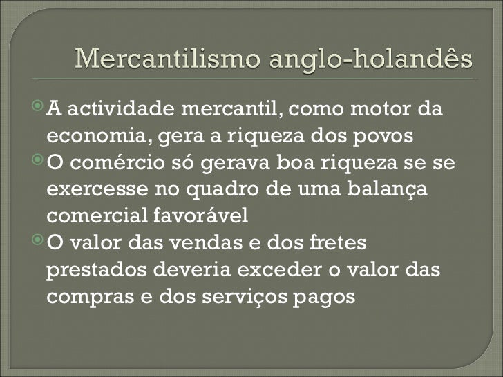 7. 7. <ul><li>A actividade mercantil, como motor da economia, gera a riqueza dos povos </li></ul><ul><li>O comércio só gerava boa riqueza se se exercesse no quadro de uma balança comercial favorável </li></ul><ul><li>O valor das vendas e dos fretes prestados deveria exceder o valor das compras e dos serviços pagos </li></ul>