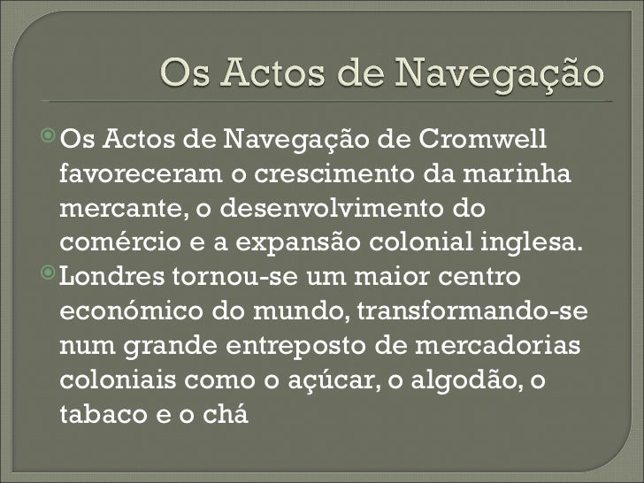 9. 9. <ul><li>Os Actos de Navegação de Cromwell favoreceram o crescimento da marinha mercante, o desenvolvimento do comércio e a expansão colonial inglesa. </li></ul><ul><li>Londres tornou-se um maior centro económico do mundo, transformando-se num grande entreposto de mercadorias coloniais como o açúcar, o algodão, o tabaco e o chá </li></ul>