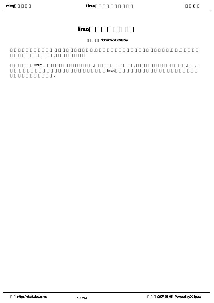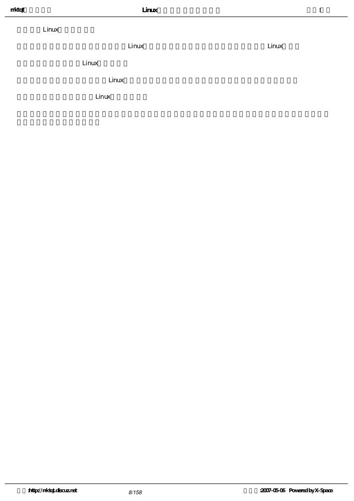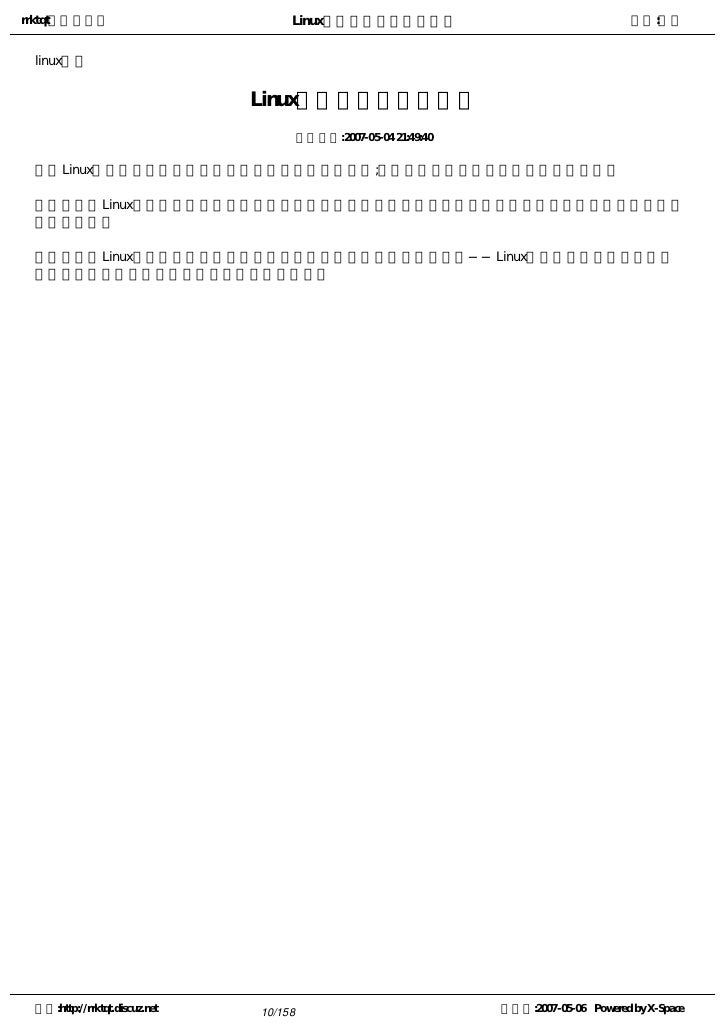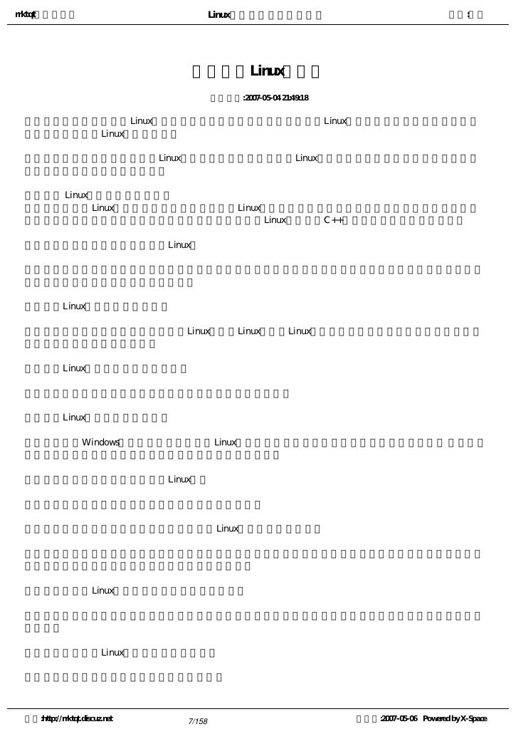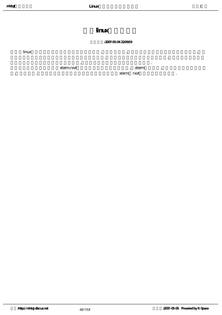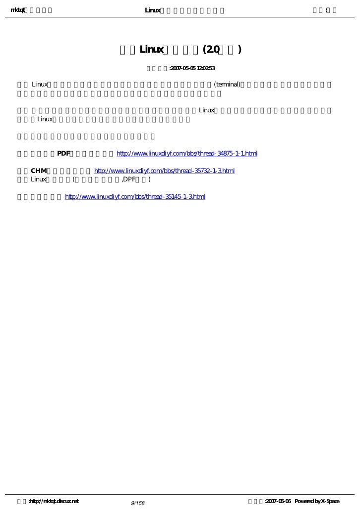9. 9. rrktqt的个人空间 Linux实用培训教程第一部分 作者:红联 练成Linux高手教程(2.0系列) 发布时间:2007-05-05 12:02:53    Linux窗口管理器,它可以打开一个特殊的窗口,即为终端窗口(terminal),它将为用户提供一个标准的命 令行接口,用户可在窗口显示的提示符中输入带有选项和参数的命令。    看着别人操作那满屏幕的洋文,不可思议,那肯定是一个Linux高手,其实你也能成为高手中的一员。使 自己的Linux技能疯狂增长就必须学会操作与看懂这些洋文。   注:请选择您喜欢的格式,内容是一样的。   全程图解PDF格式下载地址:http://www.linuxdiyf.com/bbs/thread-34875-1-1.html   CHM格式下载地址:http://www.linuxdiyf.com/bbs/thread-35732-1-3.html   Linux培训系列(第一讲至第八讲,DPF格式)   下载地址:http://www.linuxdiyf.com/bbs/thread-35145-1-3.html 空间:http://rrktqt.discuz.net 9/158 制作于:2007-05-06 Powered by X-Space